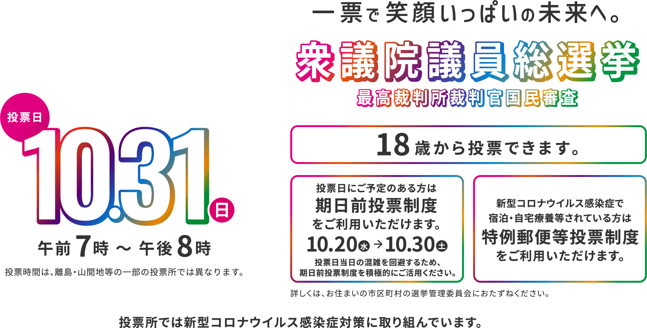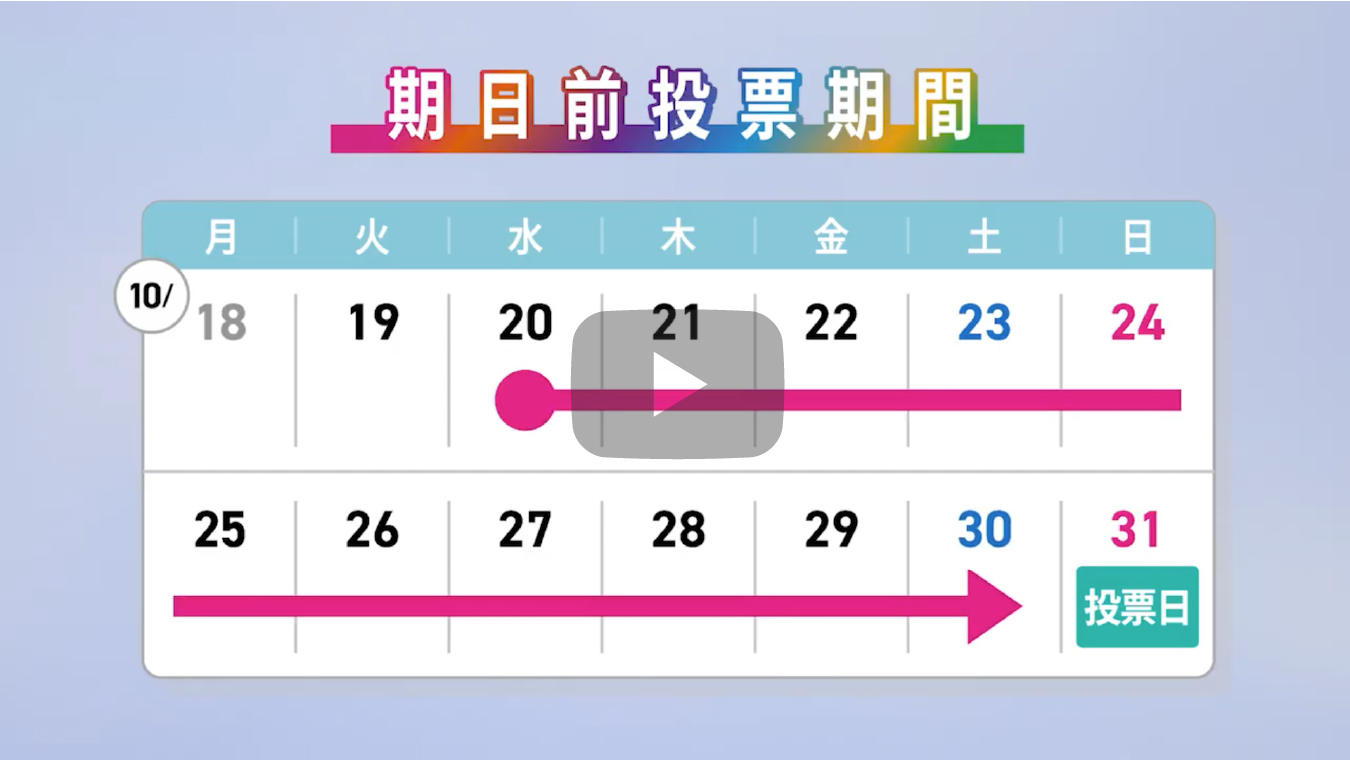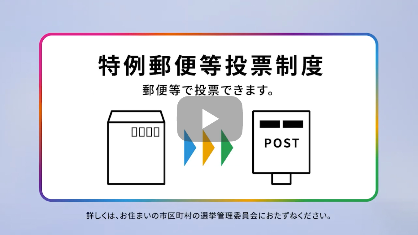 2021年 愛知県衆議院議員総選挙・最高裁判所裁判官国民審査 2023.12.23目次スペシャルプログラムWebムービーご案内スペシャルプログラム「公示日の週の金曜日」篇「公示日」篇「公示日の週の金曜日」篇 「投票日の前日・当日」篇(10月30日更新)Webムービー「全有権者対象」篇「全有権者対象」篇「若年層対象」篇「期日前投票制度」篇「特例郵便等投票制度」篇 ご案内投票方法と期日前・不在者投票制度衆議院議員総選挙候補者一覧・選挙公報・政見放送等最高裁判所裁判官国民審査 審査公報市区町村選挙管理委員会連絡先一覧